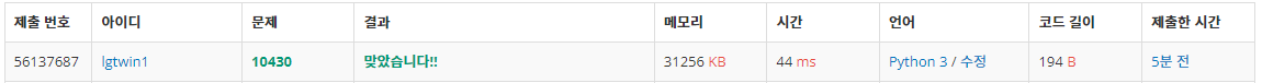 사실 풀이 방법이라 할 것도 없다. 입력값을 받고, 그 값을 변수에 저장하고, 주어진 계산을 끝낸 후 출력하면 되는 간단한 문제이다. 입력값을 input() 명령어로 저장하면 끝.