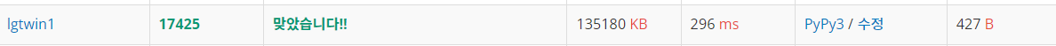 문제 풀이와는 별개로, Python3로 제출하게 되면 시간초과로 오답처리가 된다. 다만 같은 코드를 PyPy로 돌리면 정답처리가 되는데, 이는 PyPy가 Python3 보다 더 빠른 연산속도를 가지기 때문에 그런것이므로 만약 다른 문제에서도 Python3로 시간초과가 뜬다면 PyPy로 제출하는 방법도 생각해보자